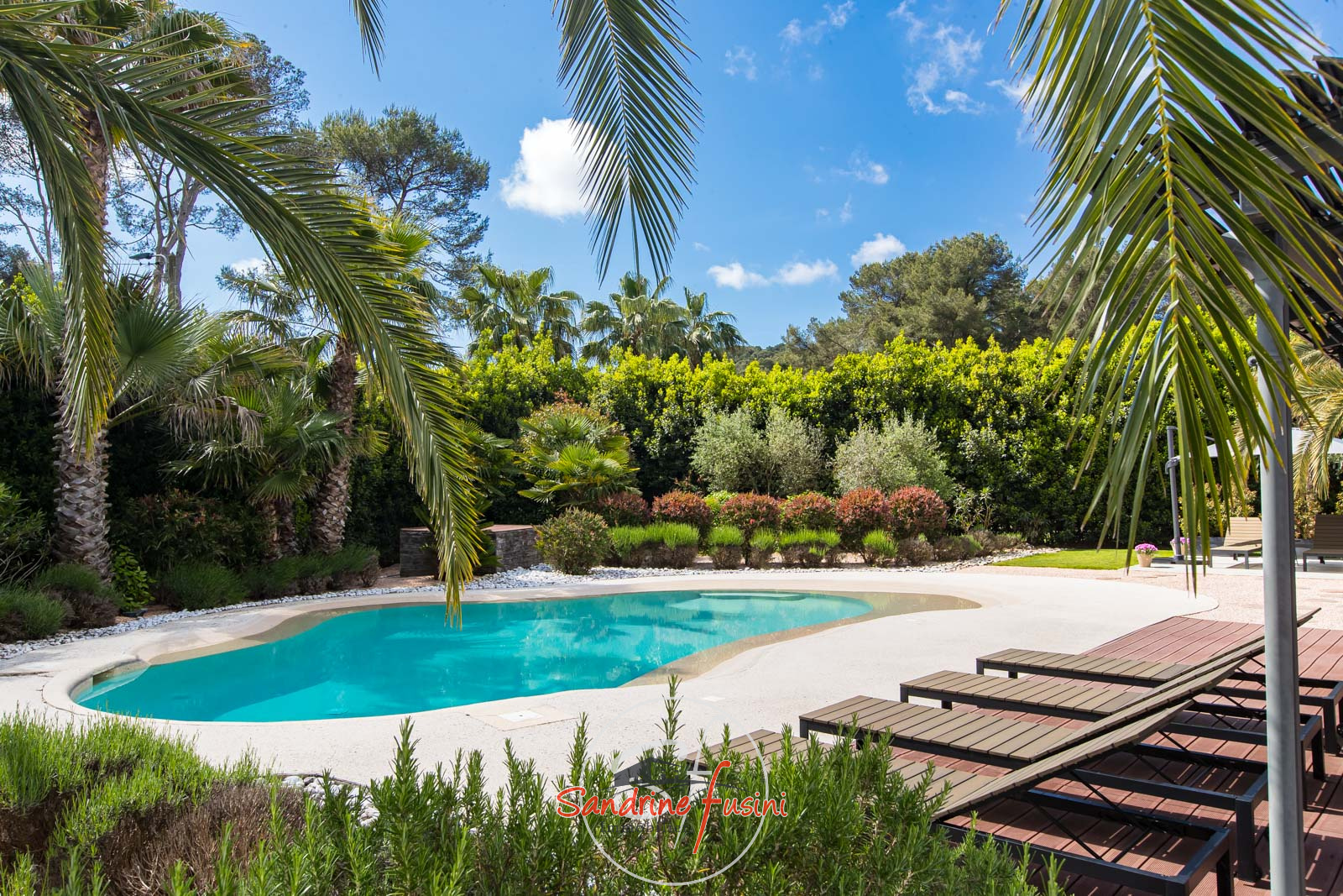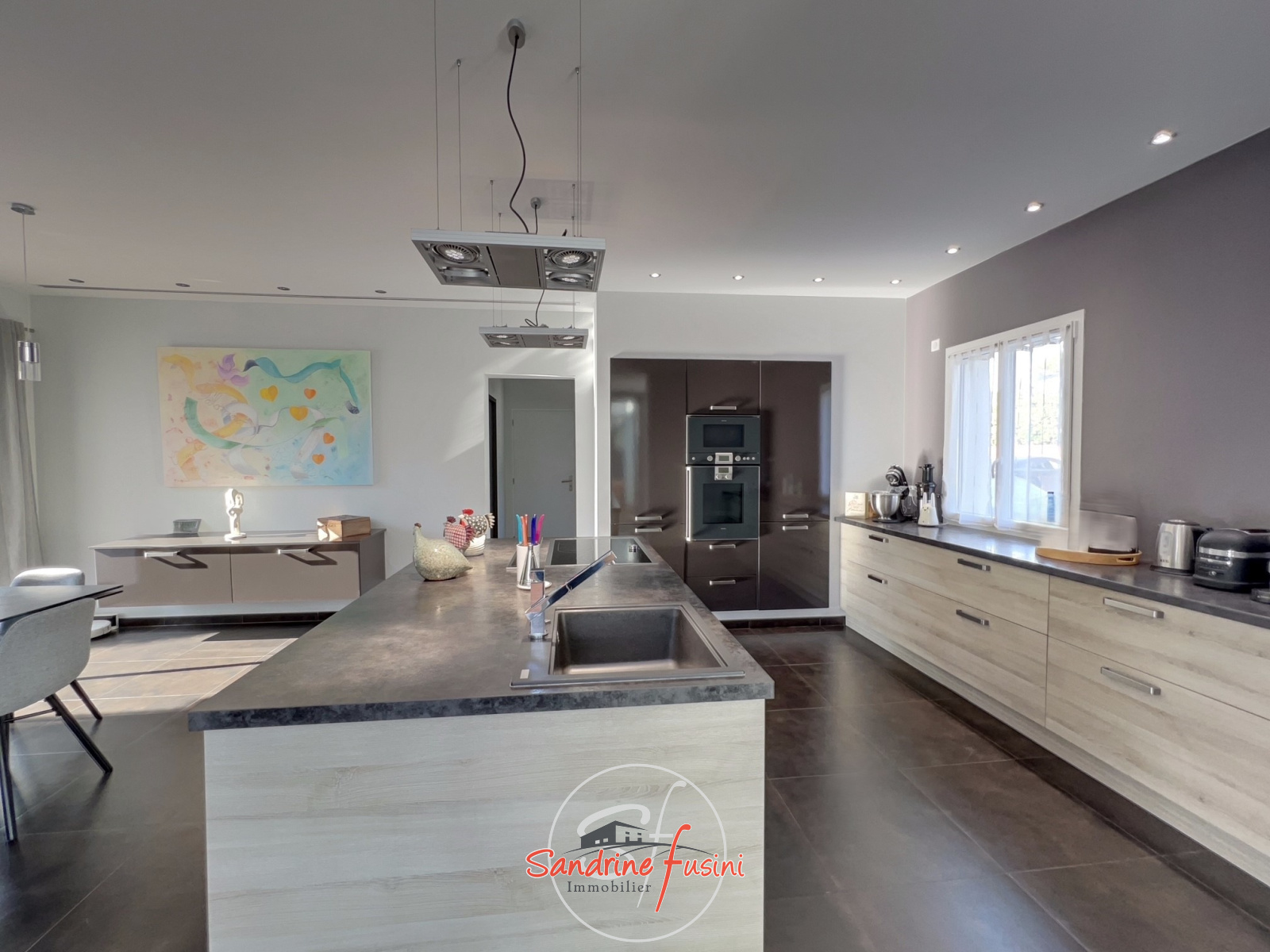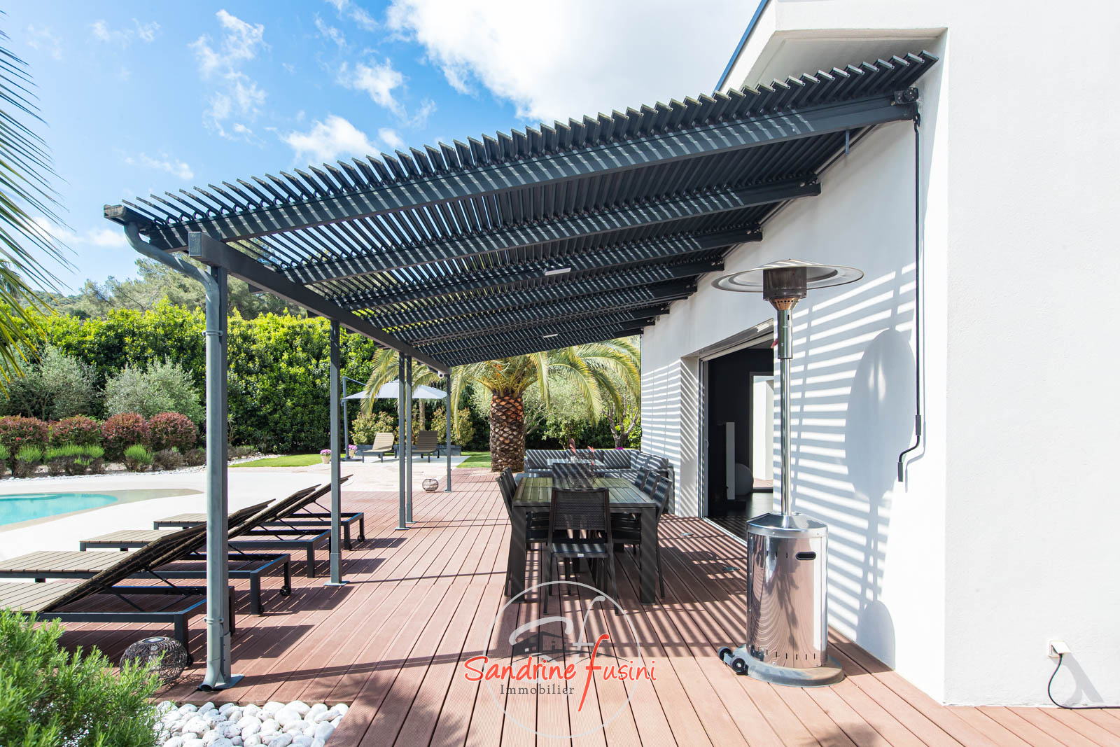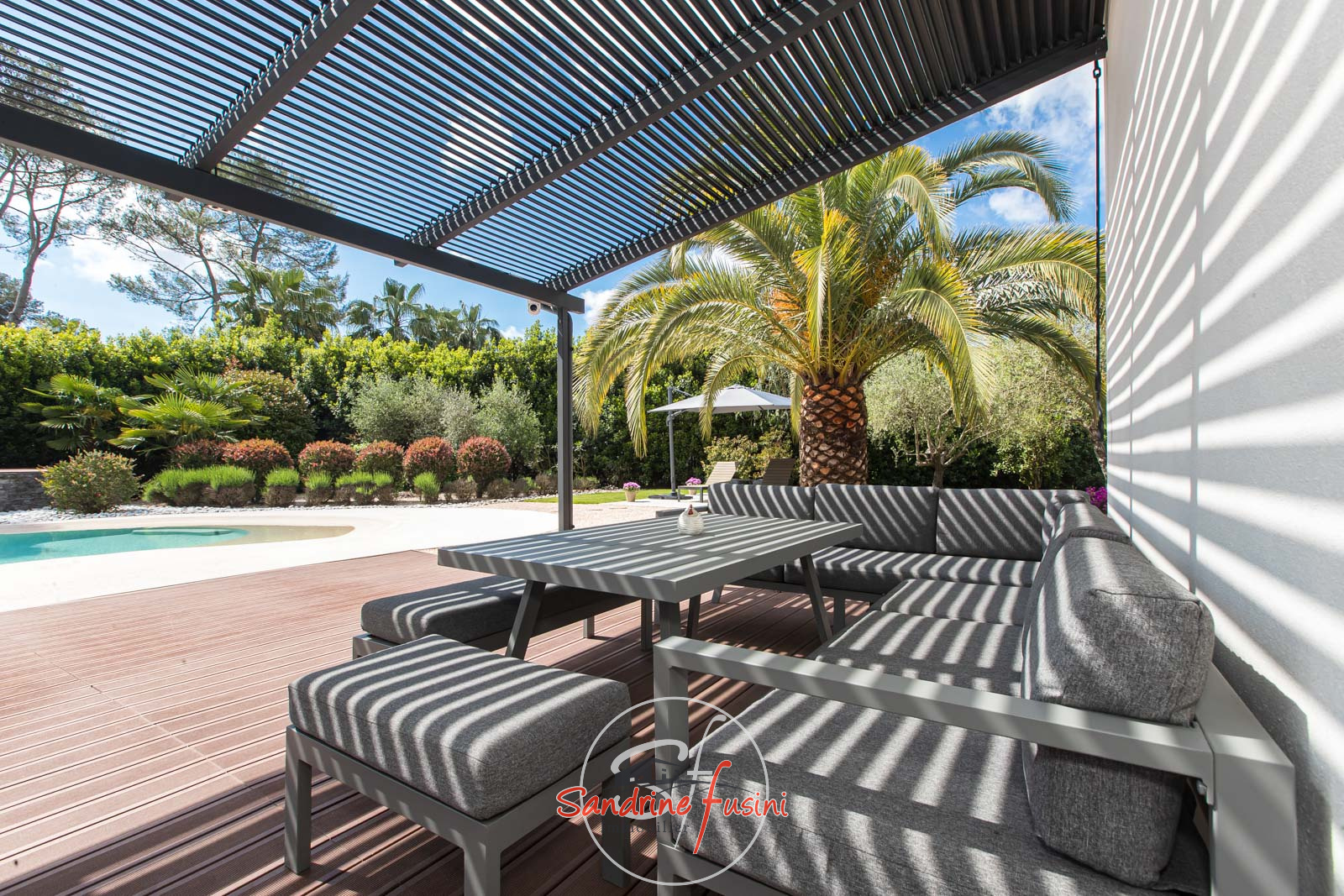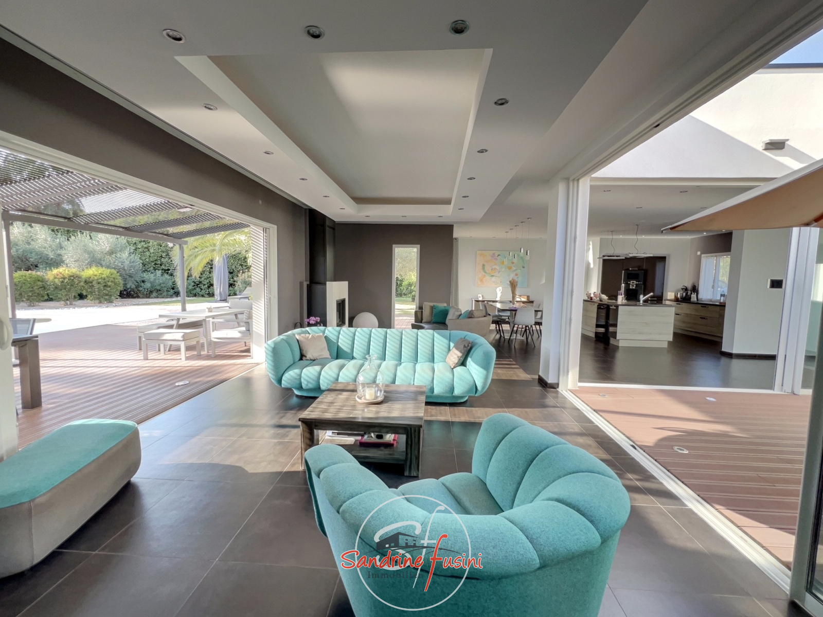 MOUGINS : Située dans un quartier résidentiel de MOUGINS, à quelques minutes de CANNES et à proximité de l'étang de FONTMERLE, Superbe villa de plain-pied à l'architecture moderne et épurée sur terrain plat de 2416 m². D'une surface d'environ 205 m², elle s'articule autour d'un patio central d'environ 20 m², offrant une belle luminosité naturelle à toutes les pièces de vie ! Le spacieux séjour est agrémenté d'un chaleureux coin cheminée (parfait pour vos soirées d'hiver), et s'ouvre sur une cuisine contemporaine entièrement équipée. Un dégagement dessert trois chambres dont deux avec salle d'eau, et une suite parentale avec salle d'eau et dressing. Sans oublier le patio, véritable espace de vie à ciel ouvert ! A l'extérieur, on retrouve une terrasse d'environ 145 m² équipée d'une pergola avec lames orientables, la piscine en forme de lagon entourée d'une superbe végétation luxuriante et sans vis à vis ! La villa est entièrement climatisée et équipée d'un sytème de domotique. Sous-sol aménagé en salle de jeux et de musique, avec cave et buanderie. Un double garage et des stationnements extérieurs viennent compléter ce bien qui grâce à ses volumes généreux, offre l'opportunité de créer une cinquième chambre ! Véritable havre de paix, nous vous invitons à venir visiter cette propriété sans plus tarder !